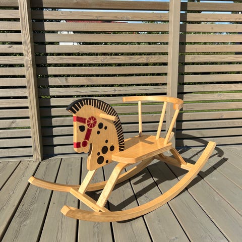 Gyngehest i tre med grått pelskledd sete