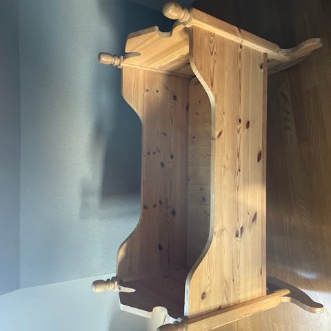 Gammel barneseng, brukt som vugge en liten stund. Egentlig en skyveseng, men vi har ikke prøvd å dra den ut. Sengehimmel følger ikke med.