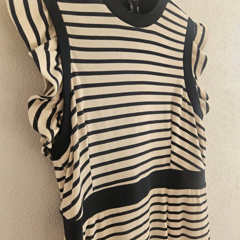 Råtøff og figurnær kjole. Strikket med gulltråder og tøff kontrast på ermene. Splitt i siden.