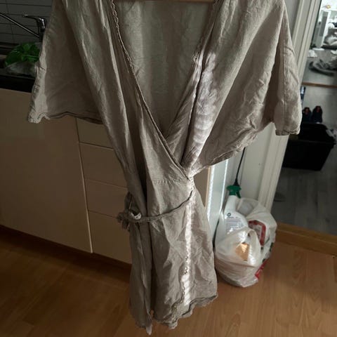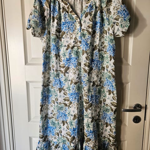 Odila kjole 60% lin og foret i tynt bomullstoff.Fargen er lys blå og hvit men kommer ikke fram på bildet.Vil nok si str 46 og ikke 50-52 som kommer opp automatisk