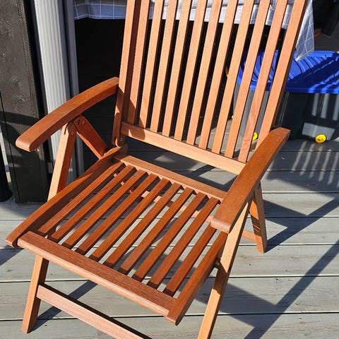 4 stoler og ett stort bord i tre selges. Helt og fint, må pusse opp litt på 2 av stolene. Blå puter følger med til alle 4.