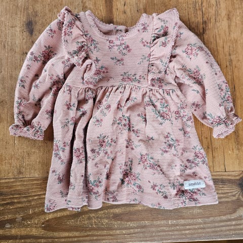 Nydelig sommersett fra newbie, lys gul kjole med blomster og bukse i samme farge med sløyfe på rumpen. Str 62