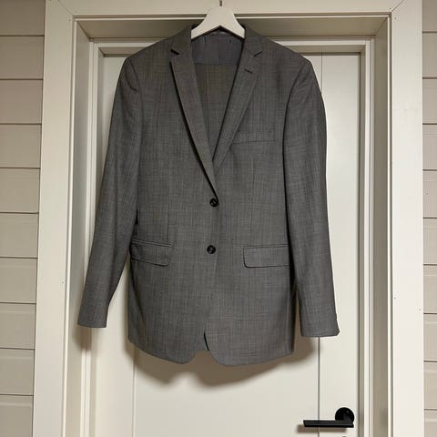 Grå/blå dress i fiskebensmønster fra San Remo. Høy kvalitets stoff.