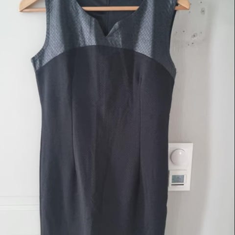 Helt ny og ubrukt kjole fra Divided serien til H&M. Størrelse medium. Falsk skinn langs sidene, gjennomsiktig stoff over skuldrene, glidelås i ryggen. Kjolen har en meget fin passform.
