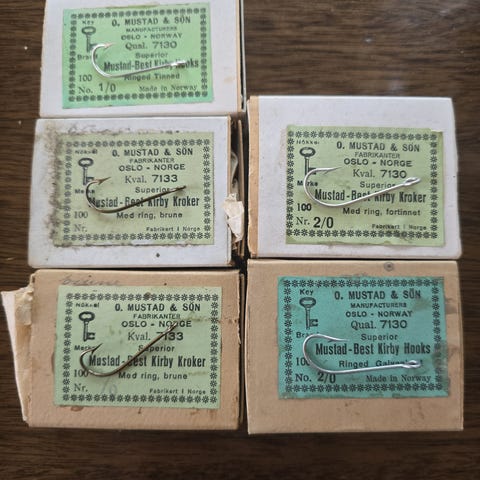 Mange typer Mustad imitasjons kroker til salgs.