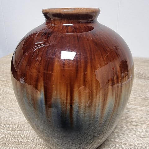 Krakkeleringer finnes. Men ellers en vakker vase med nydelig Glasur. Andreas Ollestad var en norsk gravør og keramiker. Hans keramikk fra sent på 1800-tallet var i den nye art nouveau-stilen.