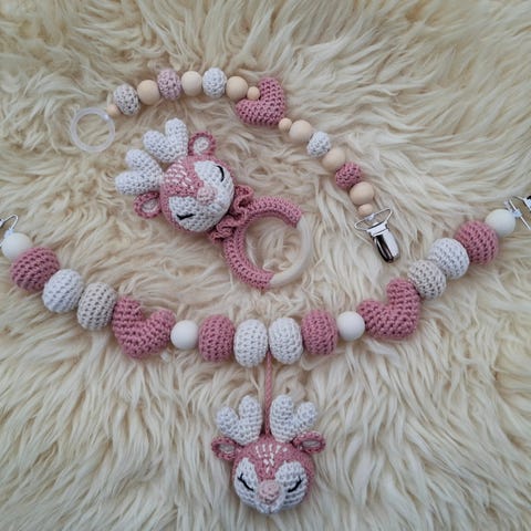 Selger unna lageret mitt med hjemme hekla vogn og bilstol pynt. Noen smokkelenker, rangler og rangle baller.