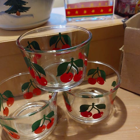 Retro glasskåler / syltetøyskåler til salgs. Dekor med grønne blader og kirsebær. Klare og fine i fargen fortsatt. En skål er noe blekere i enn de andre. Ingen nagg eller misfarging. Fremstår pene.