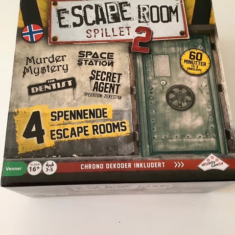 Escape Room Spillet 2 er et brettspill som inneholder fire forskjellige escape rooms: Murder Mystery, Space Station, Secret Agent og Denti. Spillet har en anbefalt spilletid på 60 minutter per rom og inkluderer en kronodekoder. Passer for 1-6 spillere.