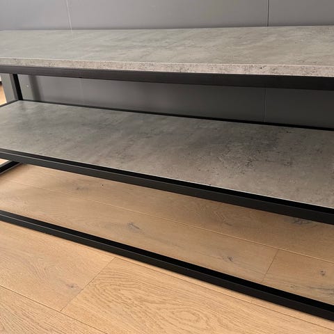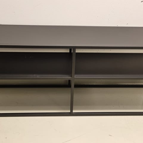 Lite brukt skohylle benk i sort metall, og grønt cord trekk.