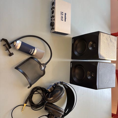 TIL UTLEIE I BERGEN Podcast pakke med 1stk Focusrite 8i6 lydkort, 2 stk Røde Podmic med bordstativ, 2 xlr kabler og 2 stk AKG K72 headsett . Leies ut via Hygglo, ta kontakt på Finn for leie og mer info. Perfekt for å lage podcaster .