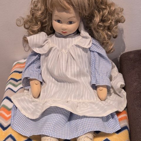 Fem små, gamle dukker m folkedrakter høyde mellom 19-16cm selges samlet. Dukken m.samedrakt har nok mistet luen sin. Evnt frakt kommer I tillegg.