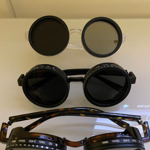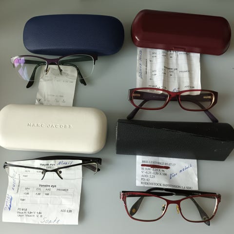 Vanlige briller (nypris ca 10 000 kr) og solbriller.