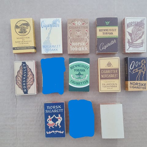 Søkeord: sigaretter, tobakk, røyking, lighter, fyrstikkeske, fyrtøy, opptenning, reklame, emballasje, samling, kuriositet, landhandleri