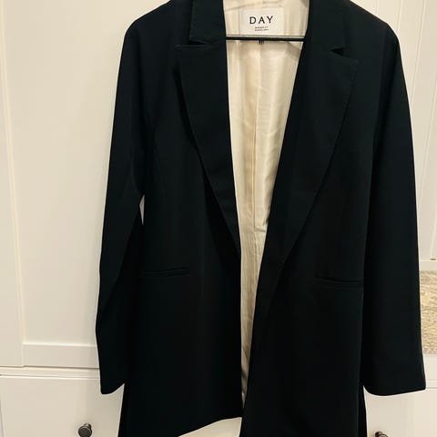 Halvlang dameblazer i sort med grå stripete fur. Superfin over kjolen eller til jeans til sommer. Ingen flekker/hull ,pent brukt.