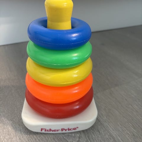 Stabletårn i plast. Lett og fin for små barnehender. Bunnen kan enkelt skrus av og snus med buet side ned for mer avansert motorisk lek.