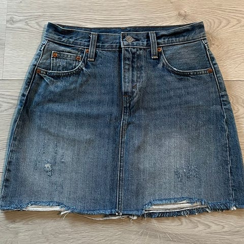 Selger et kort denimskjørt / olaskjørt i lys stenvasket finish med trendy fabrikerte hulldetaljer fra H&M.