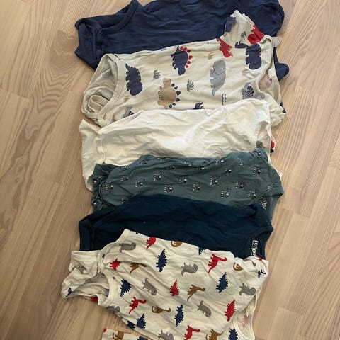 Selger pakker med bodyer i str 98. De ble aldri tatt i bruk, men ble liggende ubrukt i skapet. Noen har fortsatt lappen på.