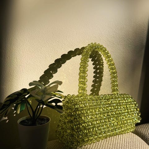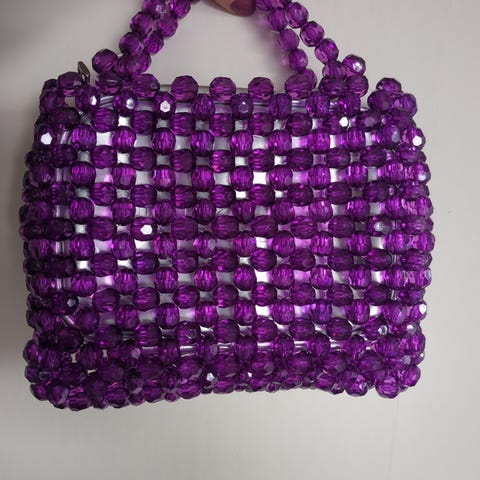 Håndlaget veske av delikate rosafargede bikoniske perler. En unik og elegant veske, håndlaget, som passer perfekt til både hverdagsbruk og spesielle anledninger.