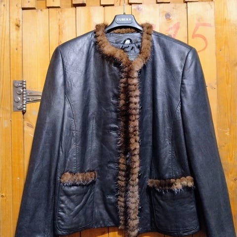 Skinnjakke med pels. Står at den er i størrelse 42, men opplever den som liten i størrelsen. Vintage. Små bruksmerker kan forekomme, men har ikke oppdaget noe ved første øyekast.
