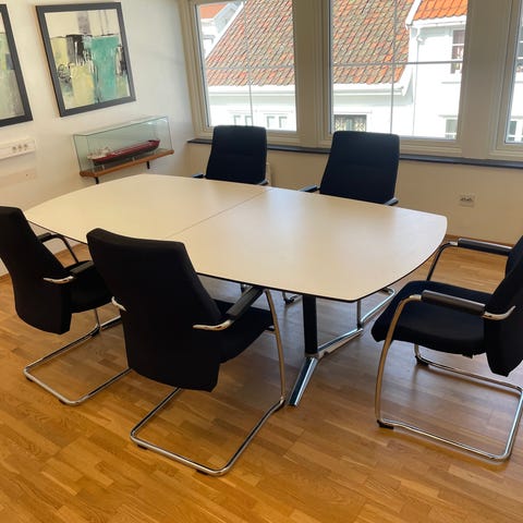 Pent og lite brukt møteromsbord med 8 stoler selges fra et konkursbo. Må hentes av kjøperen i Oslo sentrum, Rådhusgaten! Selges samlet! Bordet er solid og tungt. Salget er momspliktig! Veiledene pris er 25000 kroner.