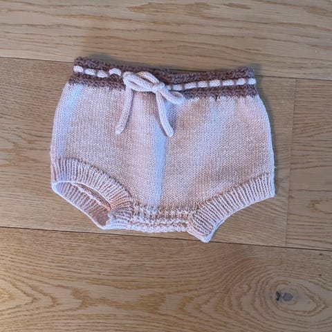 Ubrukt, hjemmestrikket Amalie bloomers i størrelsen 0-3 mnd selges. Den er strikket i dobbel tråd tynn merino fra sandnes garn i fargen pudderrosa (3511) med hvite kanter og snor i livet.