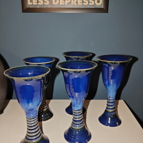 Nydelige og meget dekorative lys blå keramiske vinglass med kremhvit kant selges pga. plassmangel. Fra 1980-tallet, pent brukt. Ingen skader eller merker. Høyden er 14 cm, diameter 10 cm.