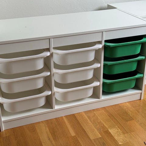 Selger 1 stk IKEA trofast hyller med hvite plastkasser. Brukt i ca et år til oppbevaring av leker. Selges da vi når har laget plassbygd løsning. Framstår som nye.