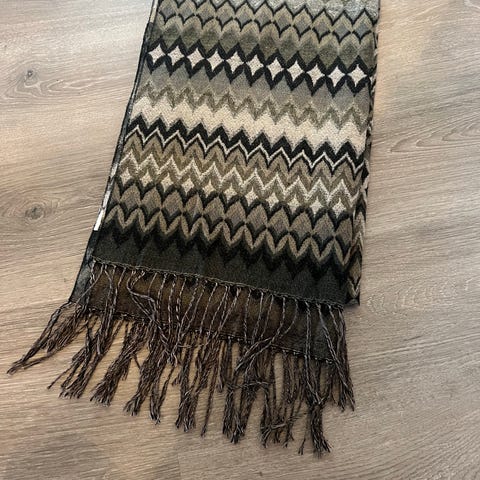 Fargerikt, zesty, skjerf, sjal, i svart/gult/rødt og grønt med sitronmønster. Mangler stoffinfo Gjetter polyester (kan ta feil).