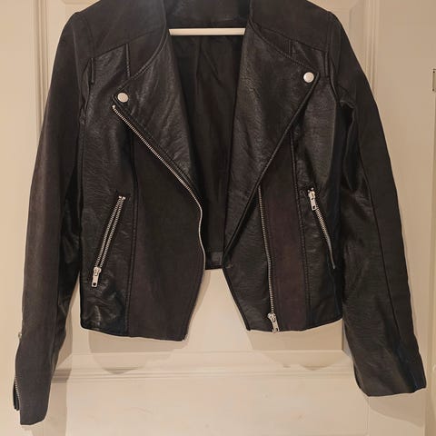 Jakke i imitert skinn selges. Fin fasong og kort i midjen. Ikke brukt. Str M/42.
