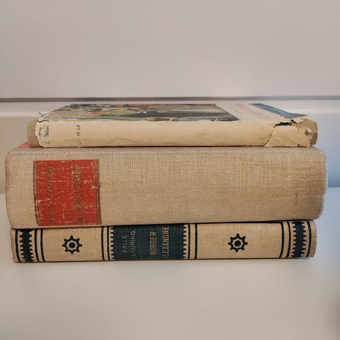 4 veldig gamle roman bøker. De er flittig lest, og bærer et sjarmerende preg av det.