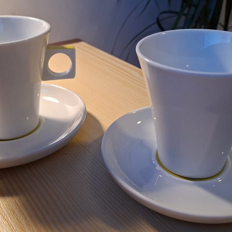 Luksuriøse porselenskopper med sølvkant og tallerken.