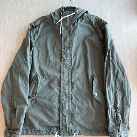 Brun og oransje anorakk fra Tommy Hilfiger i størrelse M herre/40 dame (unisexmodell). Omkrets bryst/liv er 118 cm, lengde 71 cm. Laget av en blanding av bomull og nylon. Pent og lite brukt uten flekker eller skader.