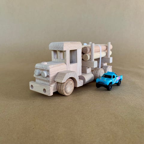 Liten retro lastebil i tre - tømmertransport. Fine av tre.