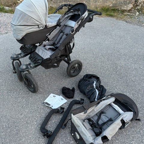 Meget pent brukt TFK Twin Adventure tvillingvogn/søskenvogn med diverse utstyr.