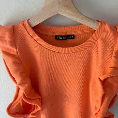 Pent brukt topp med volangermer i en nydelig vinrød/bourdeaux-farge. Størrelse XS, men vil si at den kan passe en Small også. Tykkvevd materiale med god stretch.