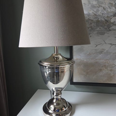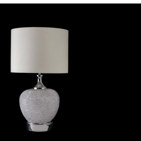 Vakker bordlampe oval hvit skjerm med sølvkant. Lampefot i sølvbelagt sprukket glass og krystaller