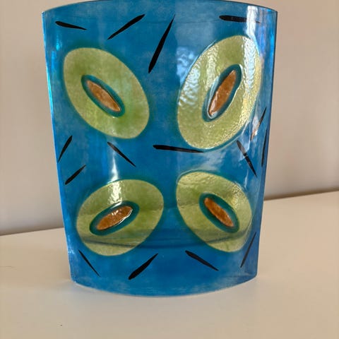 Kiboltblått og gull slår aldri feil. Denne lille feilfrie vasen er designet av Else Kamp Jensen på seksti/syttitallet og måler 14x13x4,5 cm.