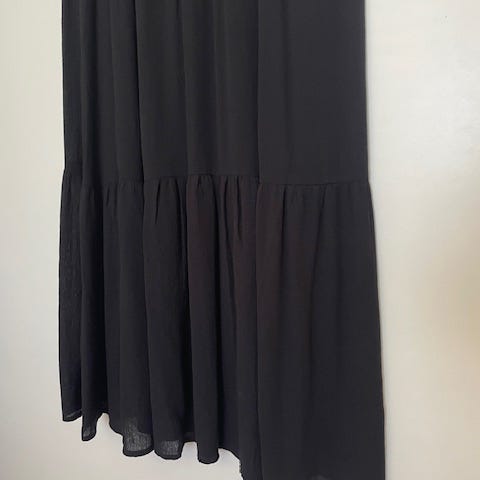 Skjørtet er mørkeblått. ( kamera viser ikke riktig farge). Er ikke brukt. Str. XL. Lengde 60 cm. Tre små knapper i siden. Er foret. Fin vidde i skjørtet.