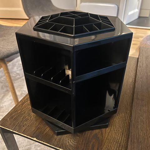 Pent/lite brukt roterende stativ til sminke/hudpleie i svart, her er det plass til mye.