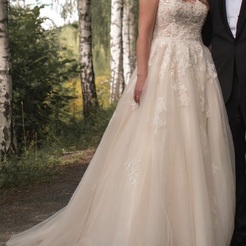 Brukt i vårt bryllup august 2023. Kjolen ble kjøpt brukt med noen små rifter som ble utbedret før bryllupet. Det ble noen små rifter etter mitt bryllup også, men det er enkelt å utbedre om du er kortere enn meg (177cm).