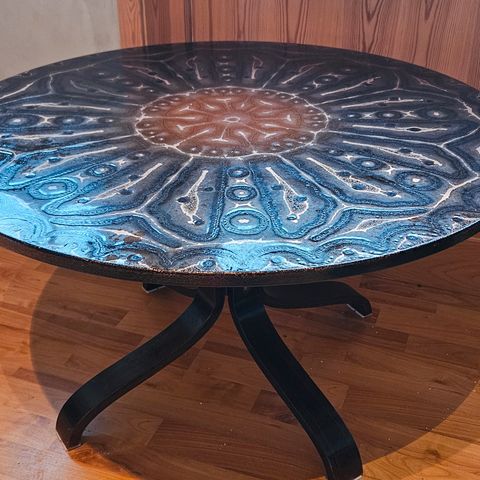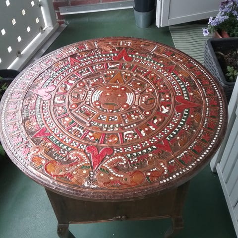 Rundt trebord som viser historiske eller mytologiske motiver. Bordet har en solid konstruksjon med buede ben som støtter bordplaten. Passer som et dekorativt møbel i stue eller oppholdsrom.