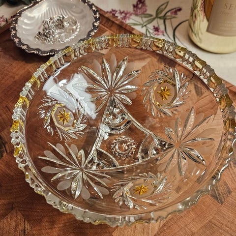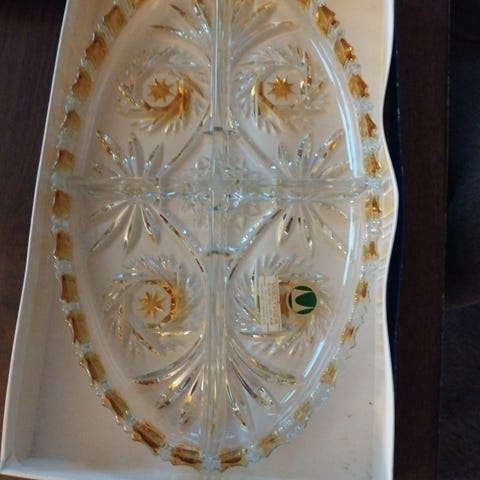 Den store typen. Se mål på bilder. Finnes mange små versjoner av denne. God stand og populært samleobjekt. Nydelige gule stjerner og mønster.