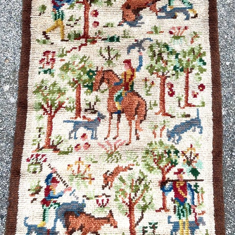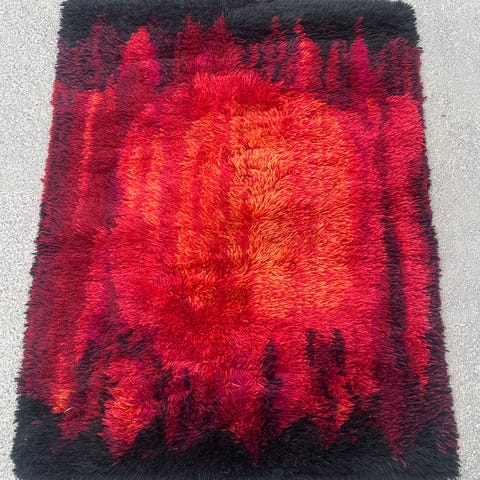 Vintage håndknyttet rye teppe designet av ARNE LINDAAS i 1959 for Sellgren. Hver knute består av minst tre tykkelser av ullgarn med tråder i tynneste lin og flere tråder i hver knute (hovedsaklig 6) avhengig av fargene. Flere sjatteringer av hver farge i hver knute. Knutene er 3 a 3,5 cm dyp. Teppet måler 160 x 100 cm. Jeg tror at teppet ble pakket bort like etter at det ble knyttet, fordi det er ingen tegn til bruk. Fargene er klare og fine, ingen slitasje, ingen gå-merker. Teppet er nytt men gammelt. Aldri renset, i original stand. Teppet kan sendes. Ingen skambud. Ved flere budgivere blir det budrunde med tidsfrist. Ingen Fiks ferdig, da teppe ikke kan forsikres for riktig verdi. Jeg kan levere hvis du bor i Oslo område eller sende med Posten for 150