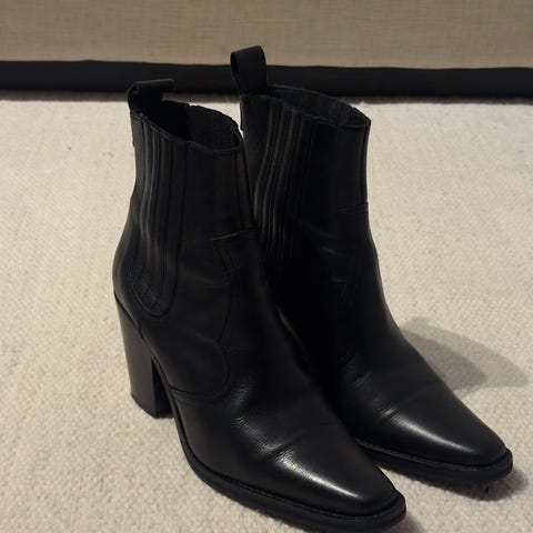 Nesten ubrukte ankelboots fra Stockholm Design Group i sort skinn med høy hæl. Ikke foret. Veldig bra kvalitet, ny pris 1999.