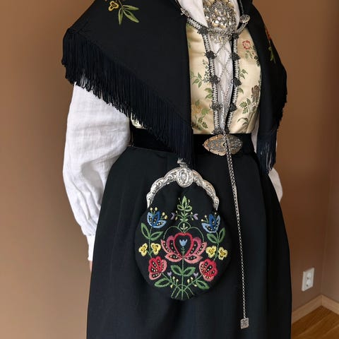 Leier ut fin Bergensbunad med oksidert sølv, kjole, skjorte, cape, veske og sko i str 37,5. (Beltet på bildet følger ikke med).