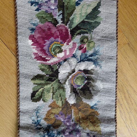 Uten oppheng til vegg. Er påsydd stoff bak. Ullkvalitet på garnet. Litt misfarging der opphenget har vært.