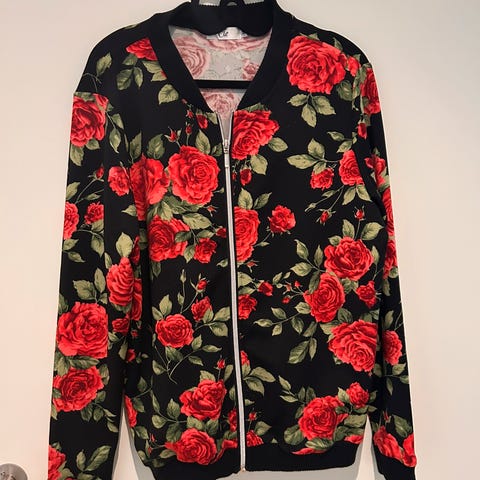 Tynn / sateng rød jakke med blomster motiv i ermene, litt kinesisk inspirert. Glidelås. Størrelse medium