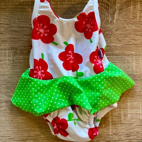 Søt romper med jordbær i Str 86. 100 % bomull. Svært lite brukt, ingen flekker, ser ny ut. Veldig fin og sommerlig.