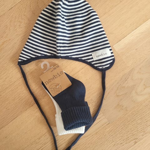 Newbie lue, votter og tøfler. Størrelse 0-6mnd. Vasket, men aldri brukt.
